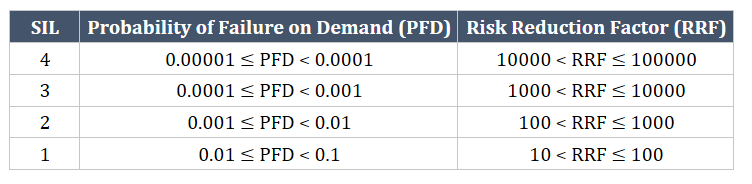 A Safety Integrity Level (SIL) Study is used to quantitatively verify the reliability of the SIF to ensure it meets the required reliability and is a feasible IPL to close the LOPA gap between the tolerable event frequency and the mitigated event frequency. SIFs can be categorized based on their reliability level. The SIL of the SIF describes the reliability range of the control loop, as seen in the table below. SIL 1 has the highest allowable probability of failure, while SIL 4 has the lowest. Each different SIL level will require different proof testing and configuration in order to meet the required reliability level.